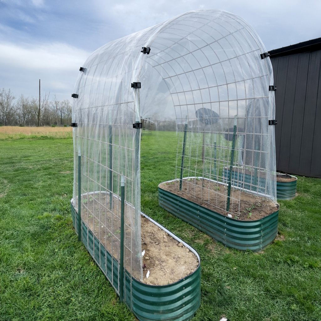 The same vineguard double-arched cattle panel trellis with plastic added to the top arch to prevent excessive rainfall from saturating the bed soil.