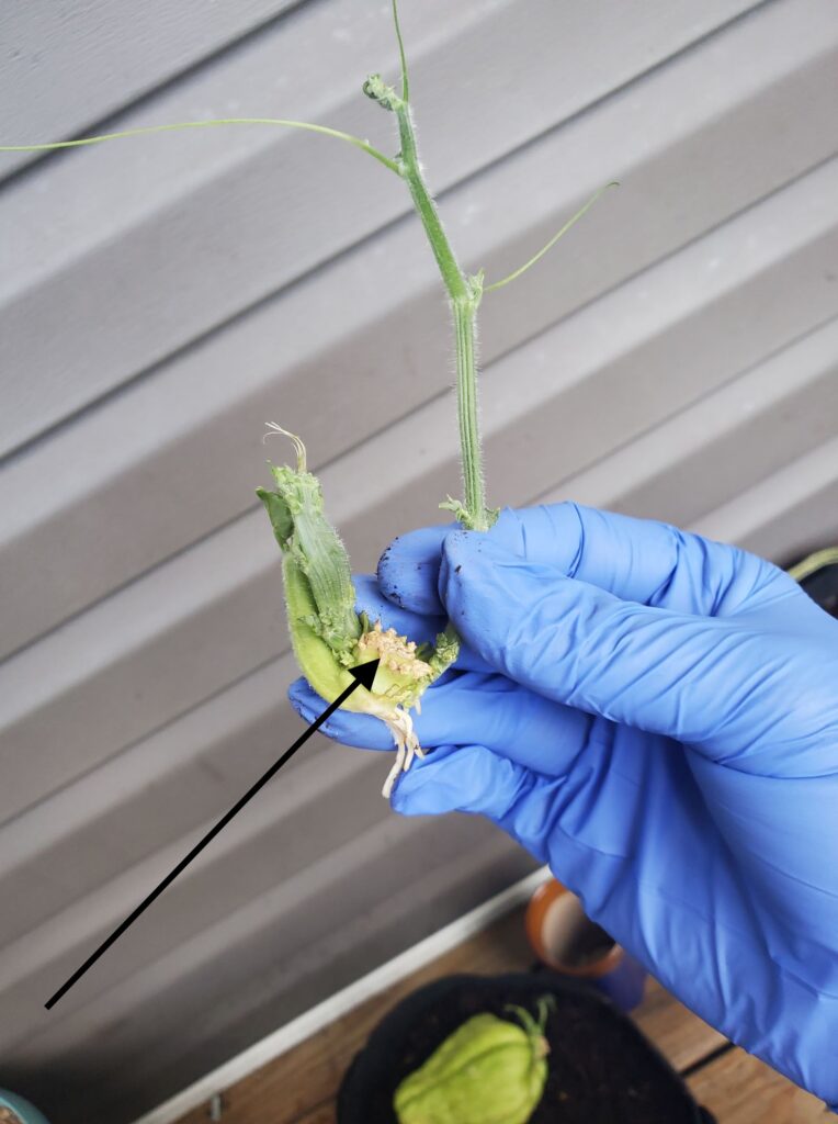 Young mirliton sprout removed from the container. The arrow points to the plant radicle (rooting organ)