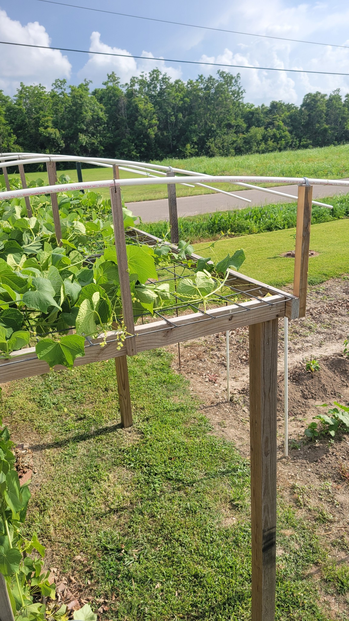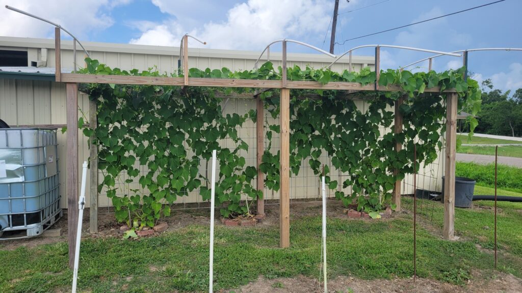 Here’s an idea. Design an arched trellis structure to protect mirlitons from excessive rain, solar radiation, and cold. I call it a Vineguard. It can be used to shunt rain away from the beds, shield the vine from intense heat, and protect it from frost.