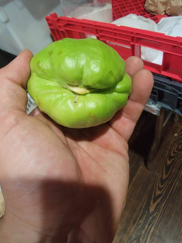 The reproduction clock on a mirliton starts the day it senses that it’s in soil. Then it will flower and fruit 110 days later.