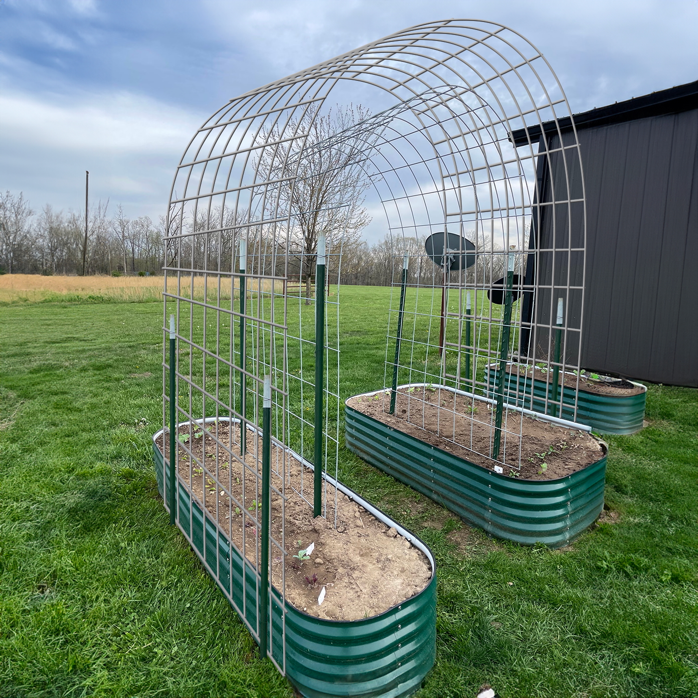 1. A cattle panel trellis with a Vineguard arch installed above it.