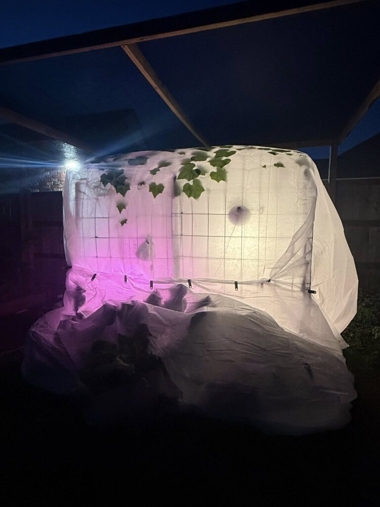 Michelle’s Glore’s lighted and heated row cover enclosure at night.