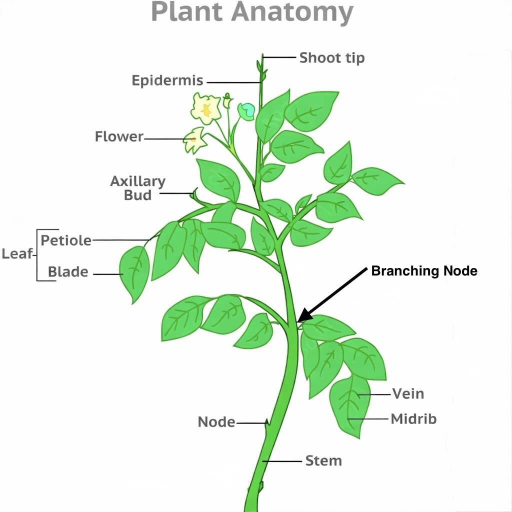 Follow the nodes up the stem and prune anywhere above the third node. A “branching node” is a node where a branch has emerged. Try to leave as many of these branching nodes as possible because they will produce a stronger, bushier plant.